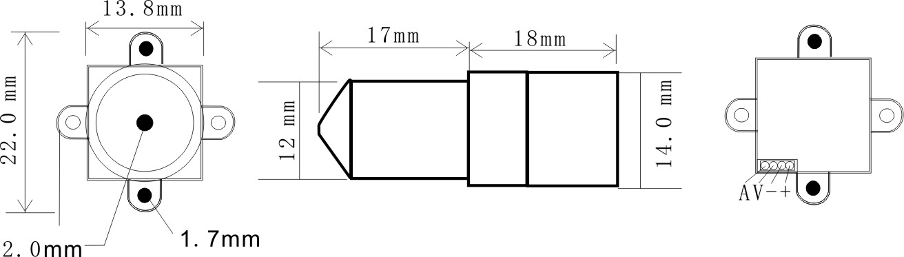 Small size(14X14X35mm) and light weight(8g), with two screw holes(screws provided), it is easy to install into the ceiling, wall, cabinets, equipments, etc. for safe surveillance.0.008lux super low illumination, which can see clearly in almost complete darkness.30 degree view of angle,which can record clear detail of image.