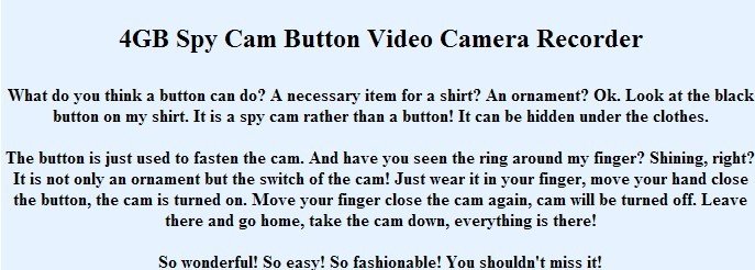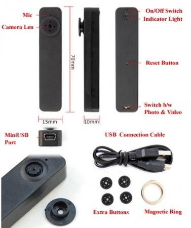Features: Mini Size and Hidden under the Clothes Magnetic Ring Switch for Turn on/off Provide more Clothes Buttons for Replacement Video Recorder with Audio Can be Used as USB Flash Memory Storage Device Built-in Microphone Built-in Rechargeable Lithium Battery Charge with USB Cable to PC No driver is needed Brand New